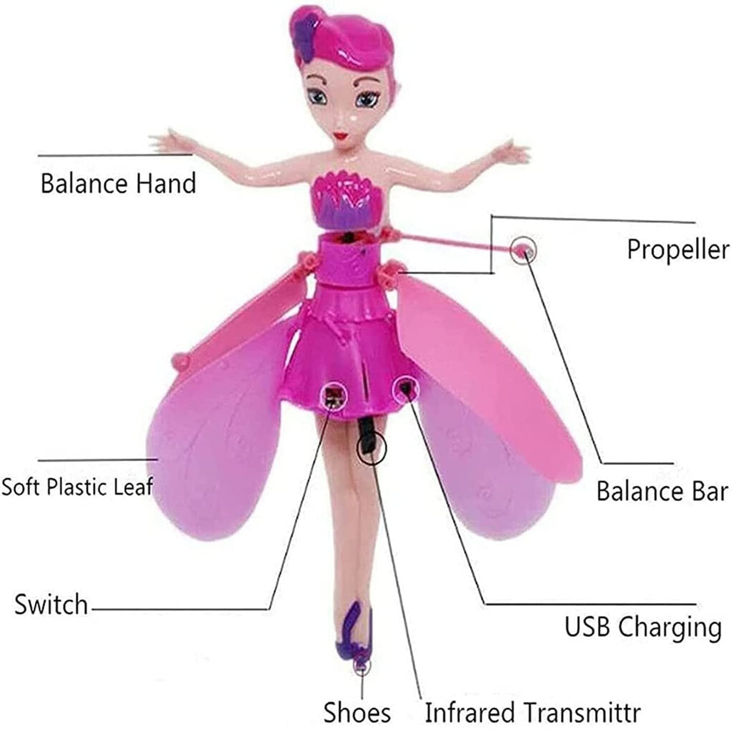Magically Controlled by Your Hands: Easily charge your Flying Fairy Toys with the USB charging cable. You can put your hand underneath to control it in the air for interactive play. And control its landing or flying with the remote controller,easy to fly with simple operation,especially designed for beginne Flying Princess is hand controlled flying toys,easy to control for young kids. When you turn it on the lights flash brightly. Flying fairy has great visual appeal for any children. Especially at night in a darkened room it looks very fantastic. Flying fairy toy can bring you a happy time with your kids!
