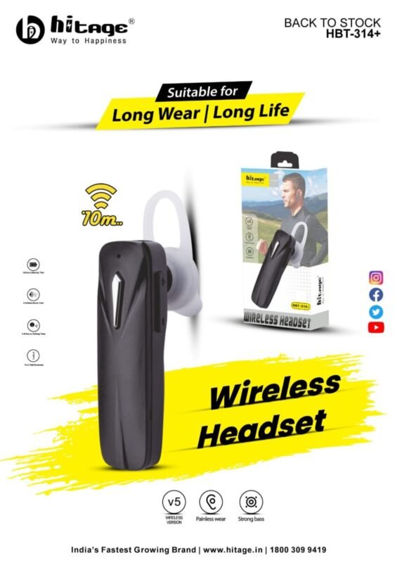 HITAGE HBT-314+ WIRELESS HEADSET- Enjoy wireless music and answer phone calls in crystal stereo sound with this Bluetooth Earphone. It connects easily to your mobile phones, tablets, IOS or other supported devices using Bluetooth .