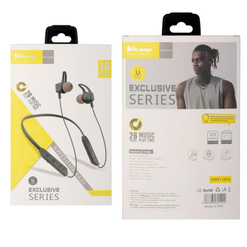 Hitage NBT-1954 Exclusive Series 26 Hours Music Awesome Bass 10 mm Driver, You can listen to music and attend calls for up to 26 hours Music AT Moderate Sound . 60 Hours Talk Time, 300 hours of standby time due to its powerful 250 mAh lithium polymer battery. You can easily manage calls and control music with the help of its 3 button control panel. This comes with exceptional features such as