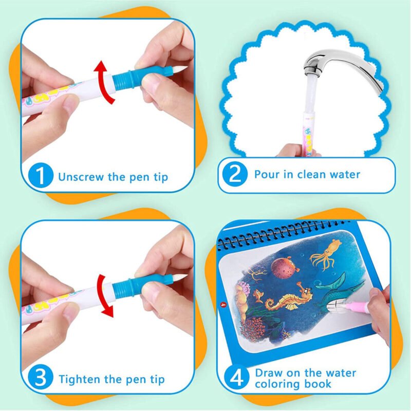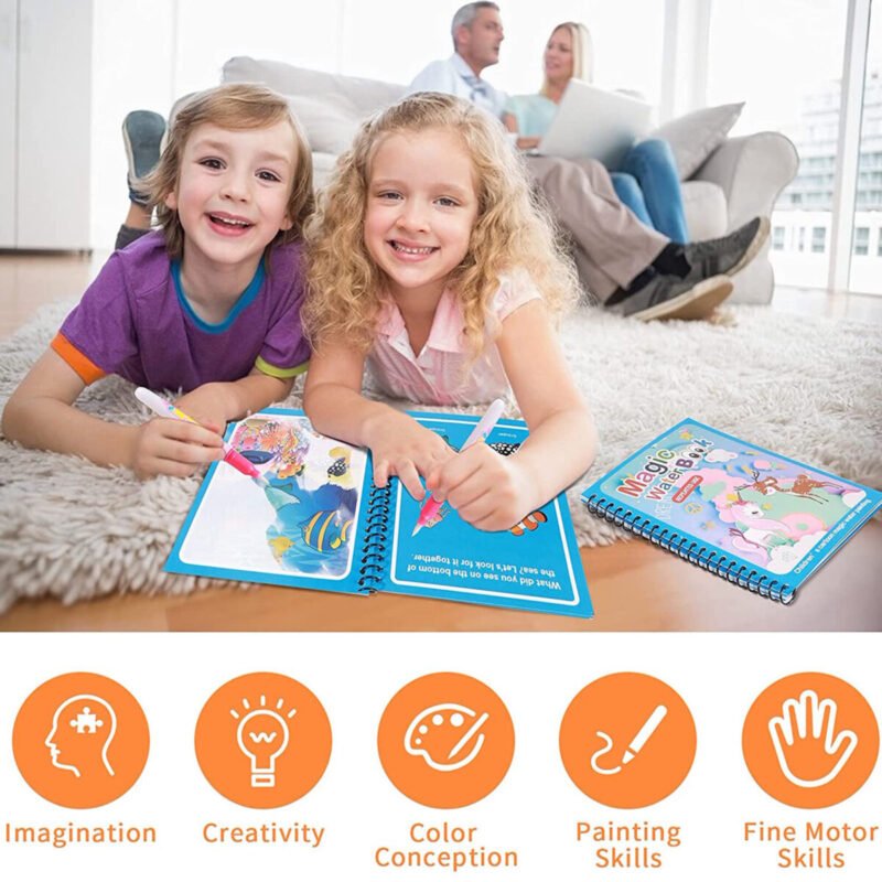 There are different Magic water coloring book (Transportation /Animals/ Fruits & Vegetables / Marine Life ) to encourage kids to develop basic perception of reading & writing, creation, imagination and visual discrimination.